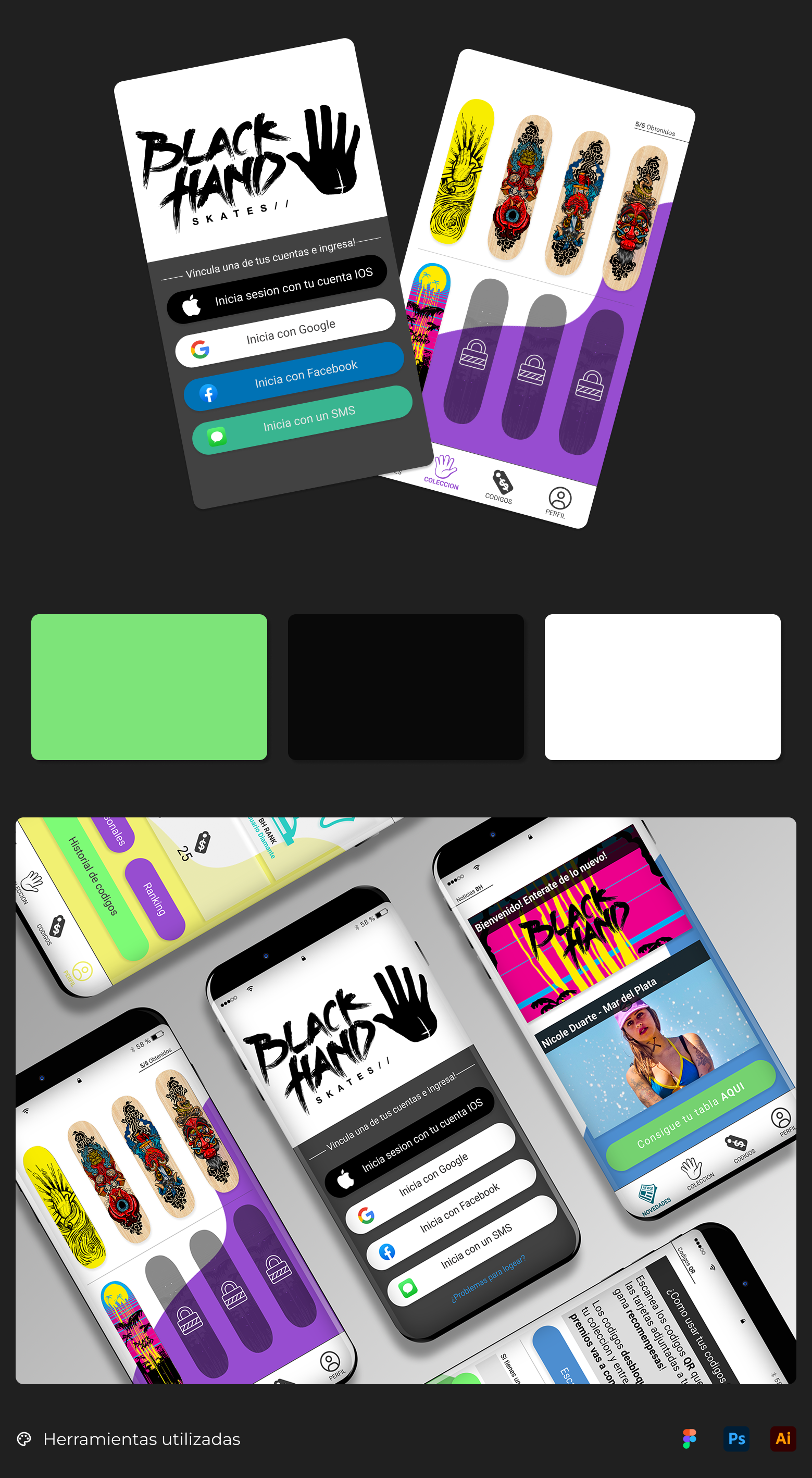 Una de las ideas más destacadas del proyecto fue el desarrollo de una web app interactiva, en la cual cada tabla de nuestras colecciones incluía un código único. Al ingresarlo en la aplicación, los usuarios podían obtener descuentos en futuras compras, sumar tablas a su colección digital y acceder a noticias y novedades relacionadas con la marca y la cultura del skate.