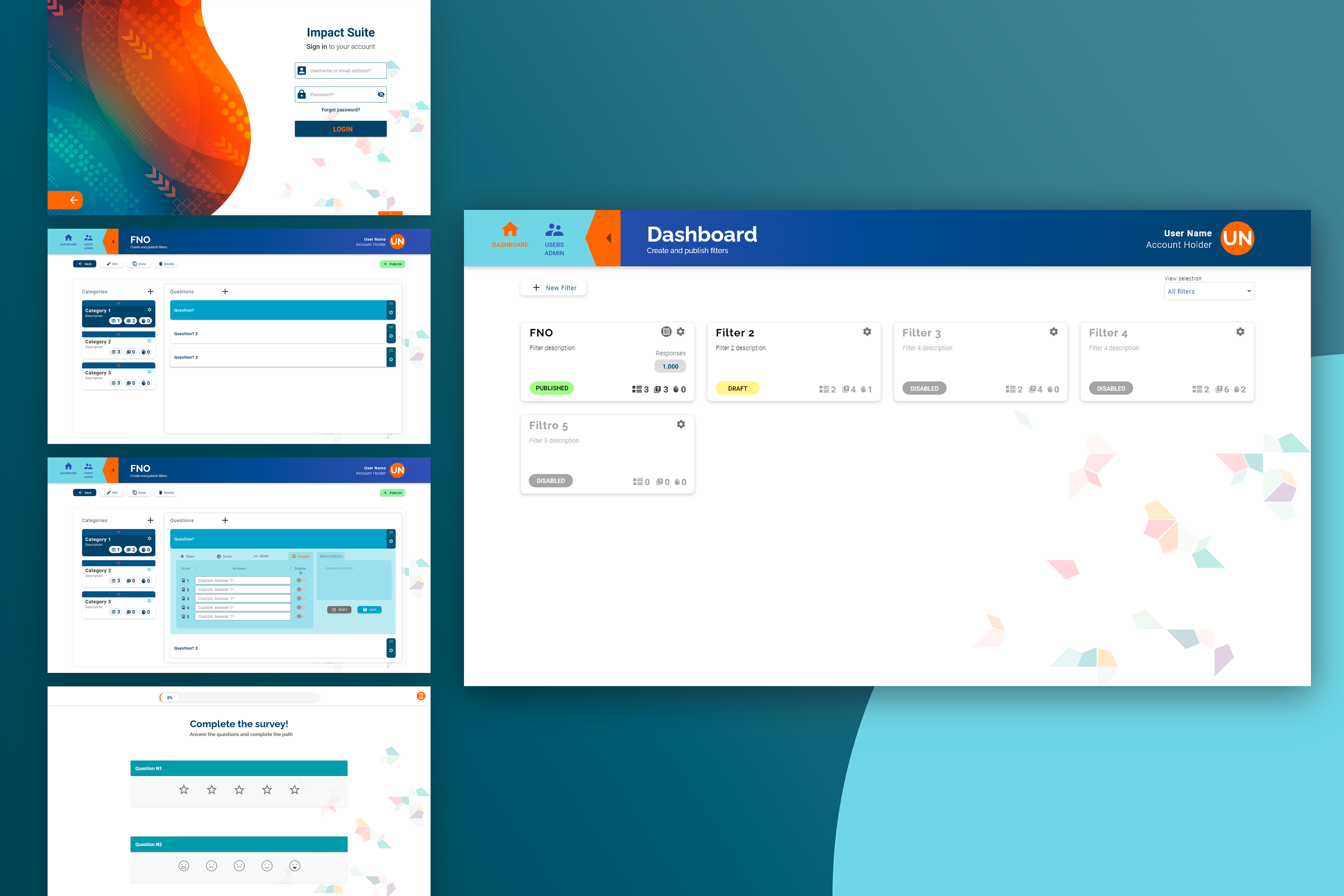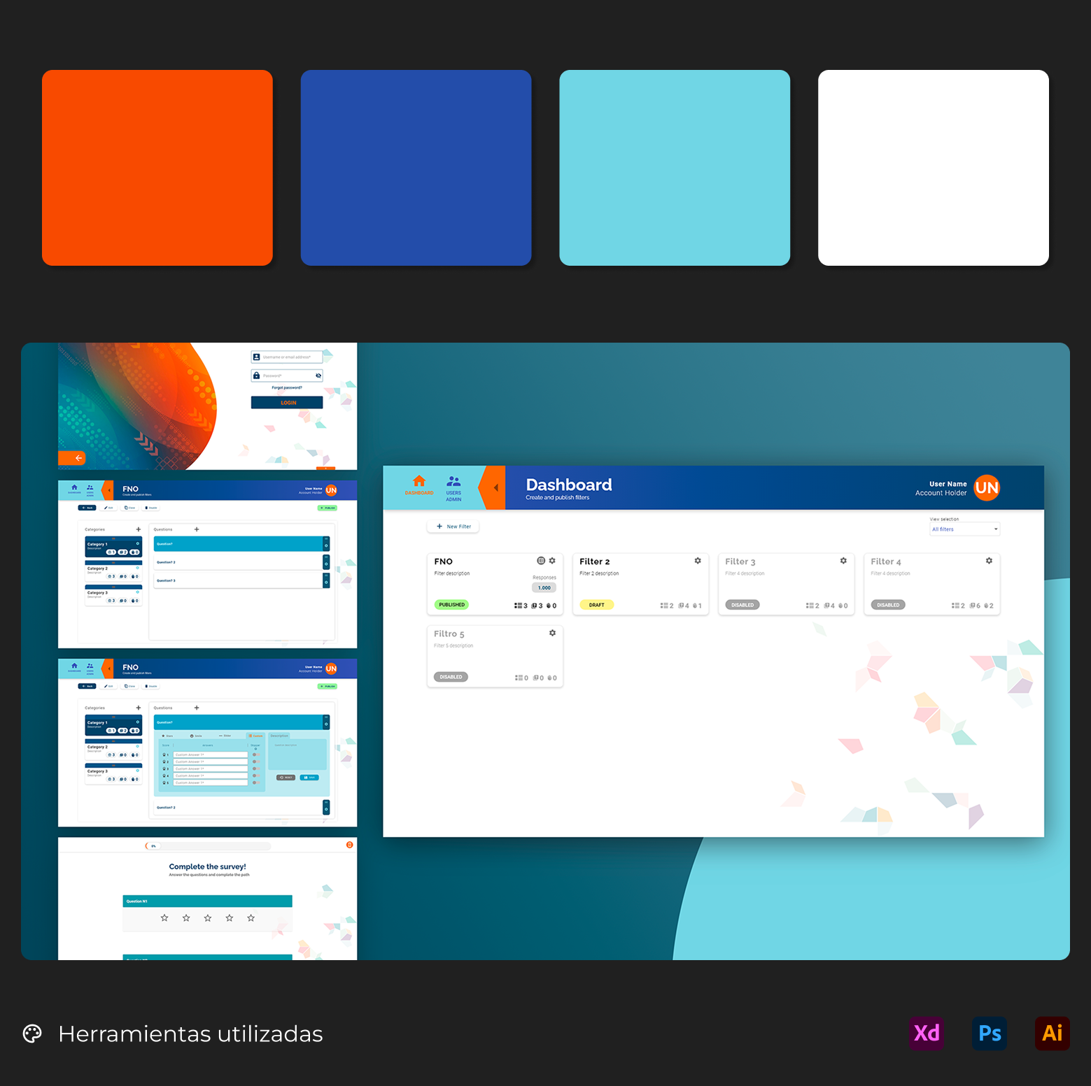 • Panel interno de administración, que permite a distintos roles gestionar encuestas, usuarios, empresas asociadas y permisos de acceso.