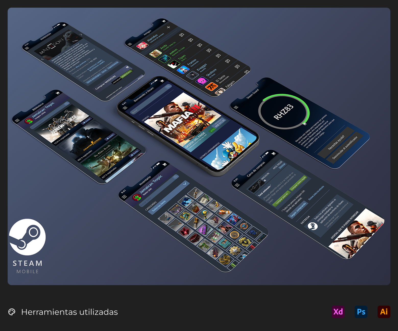 Esta fue una propuesta de rediseño para Steam, desarrollada en 2022, cuando la aplicación mobile presentaba importantes limitaciones en usabilidad y dificultaba que los usuarios encontraran la información que necesitaban de forma rápida y clara.